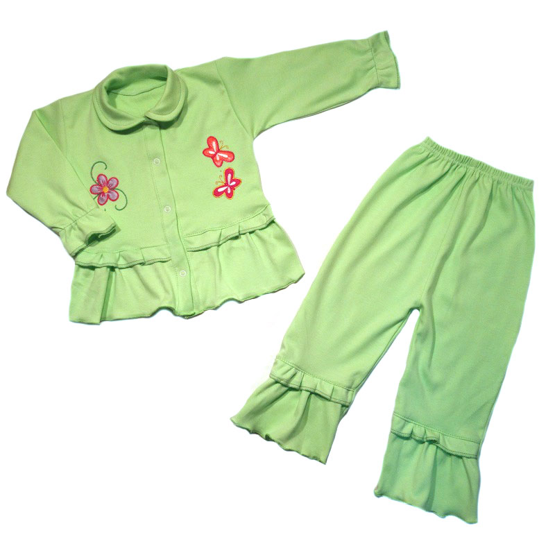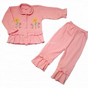 Костюм состоит из кофточки с воротничком, с длинным рукавом на конце на резиночке, спереди на кнопочках, украшена вышивкой на обеих полочках, снизу с рюшкой,  и штанишек на резинке, снизу украшены рюшкой.